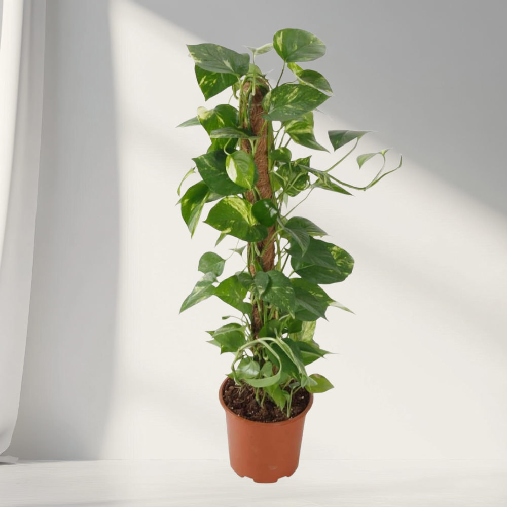 The Money Plant is a classic indoor favorite known for its trailing and climbing vines with heart-shaped green leaves splashed with golden variegation. Trained on a moss stick, it grows upright and adds a lush, vertical accent to any space. Extremely easy to care for, this hardy plant thrives in a wide range of indoor conditions.